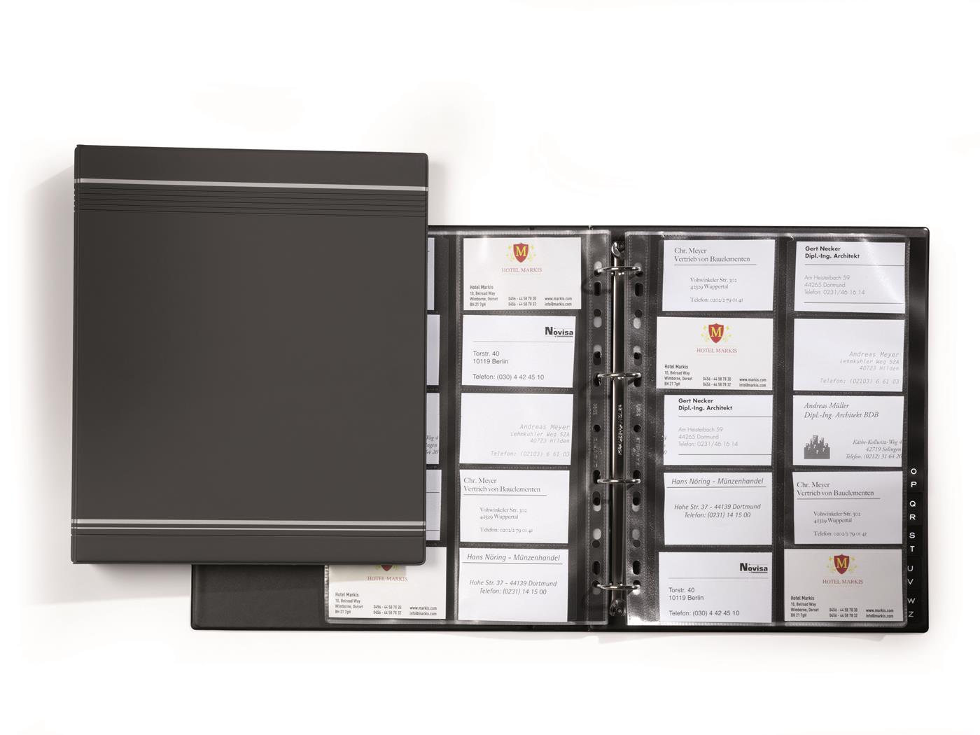 Album na wizytówki Durable VISIFIX A4 na 400 wizytówek. Okładka matowa w kolorze granatowym lub grafitowym, mechanizm ringowy, przekładki A-Z, możliwość umieszczenia dodatkowych wkładów (maksymalnie do 600 wizytówek). Jednostka sprzedaży 1 sztuka