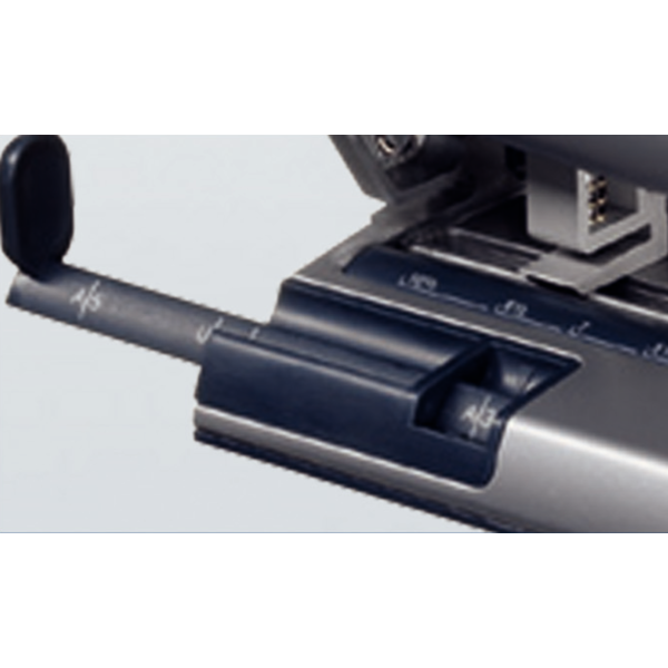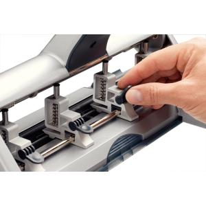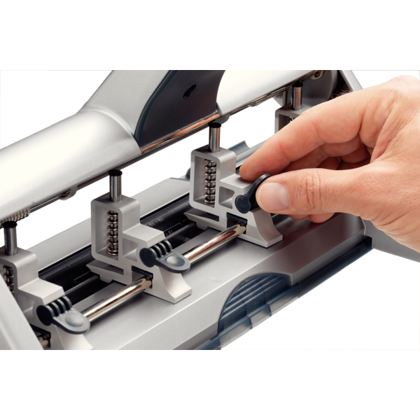Dziurkacz wyposażony jest w prowadnicę z czytelnymi oznaczeniami w centymetrach i calach oraz ustawieniami odpowiadającymi popularnym formatom dokumentów i segregatorów. System zatrzaskowy umożliwia szybkie ustawienie liczby otworów i ich położenia, co znacząco zwiększa komfort pracy.