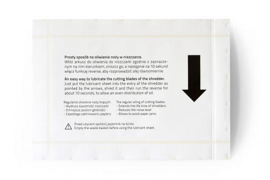 Każdy arkusz zawiera 6 ml oleju, który równomiernie rozprowadza się po mechanizmie tnącym podczas niszczenia.