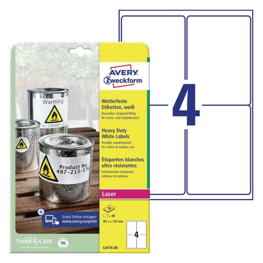 Etykiety foliowe AVERY ZWECKFORM Heavy Duty A4 99.1 x 139 mm | 20 arkuszy. Białe, odporne na warunki atmosferyczne etykiety L4774-20 w formacie 99,1x139 mm do drukarki laserowej firmy AVERY ZWECKFORM są szczególnie wytrzymałe, także na zewnątrz. 80 etykiet z matowej folii poliestrowej na 20 arkuszach. Silne trwałe przyleganie sprawia, że są one idealne do etykietowania odpornego na warunki atmosferyczne, niezawodnego i trwałego. Wytrzymałe etykiety z folii poliestrowej są odporne na oleje, zabrudzenia, promieniowanie UV i temperaturę (od -20°C do +80°C), a także na wodę i rozdarcia. Są znacznie bardziej wytrzymałe niż standardowe etykiety papierowe. Zaprojektuj i wydrukuj swoje etykiety odporne na warunki atmosferyczne w szybki i łatwy sposób - aby uzyskać darmowe szablony i oprogramowanie Avery Zweckform odwiedź stronę www.avery-zweckform.pl/oprogramowanie skorzystaj z szablonów zintegrowanych z pakietami Microsoft® Office. Optymalna przydatność do drukarek laserowych.