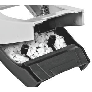 Model wyposażony jest w łatwy do opróżniania pojemnik na ścinki, zamocowany na zawiasach. Blokada uchwytu ułatwia przechowywanie urządzenia i oszczędza miejsce na biurku lub w szufladzie.