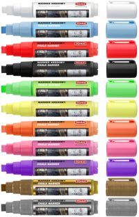 Marker kredowy TOMA TO-291. Marker z płynną kredą, do pisania po tablicach czarnych, białych, po szkle i powierzchniach plastikowych. Zmywalny wodą np. tradycyjną gąbką, do użytku wewnątrz pomieszczeń, nasączenie końcówki fibrowe, bezwonny tusz pigmentowy, nie zawiera xylenu. Końcówka ścięta 5 x 8 mm, tusz 8 g. , jest dostępny w 11 kolorach tuszu.