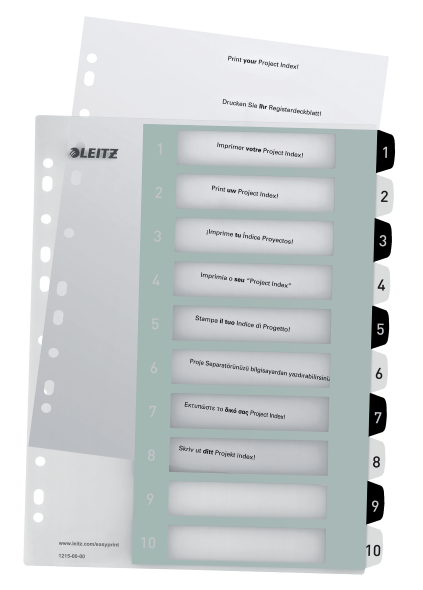 Przekładki numeryczne do nadruku tekstu na kartę Leitz Wow 1-10 | 12150000. Wydrukuj elegancki i ekskluzywny spis treści za pośrednictwem www.leitz.com/easyprint. Mocne i trwałe, z wytrzymałego polipropylenu o grubości 0,3 mm. Format A4 Maxi pozwala na szybki dostęp do dokumentów, nawet w przypadku, gdy są włożone do koszulek. 10 przekładek numerycznych 1-10 ułatwiających sortowanie. 11 uniwersalnych dziurek umożliwiających wpinanie do segregatora.