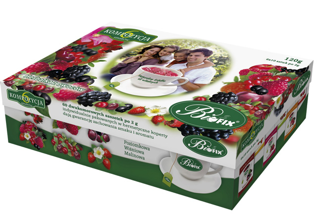 Opis produktu: Kolorowe pudełeczko, w którym znajdziemy aż 6 smakowych kompozycji herbatek Bi fix: malinową, żurawinową, dziką różę, poziomkową, wiśniową i wieloowocową. W szkatułce znajduje się 60 ekspresowych herbatek (po 10 z każdego rodzaju). Każda z nich zamknięta jest w hermetyczną kopertkę, która pozwala na zachowanie niepowtarzalnych aromatycznych i smakowych właściwości naparu. Napoje te są wyjątkowo smaczne, jak również wywierają zbawienny wpływ na nasz organizm. Sposób parzenia: Jedną saszetkę umieścić w filiżance. Zalać wrzątkiem. Zaparzać 3-5 minut.