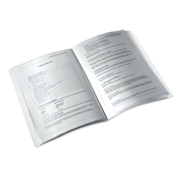 Album zawiera 20 przezroczystych koszulek wklejonych w grzbiet, które umożliwiają przechowywanie do 40 kartek A4 (po 2 kartki w jednej koszulce, 80 gsm). Dzięki etykiecie na grzbiecie łatwo opiszesz zawartość, co ułatwia identyfikację materiałów.