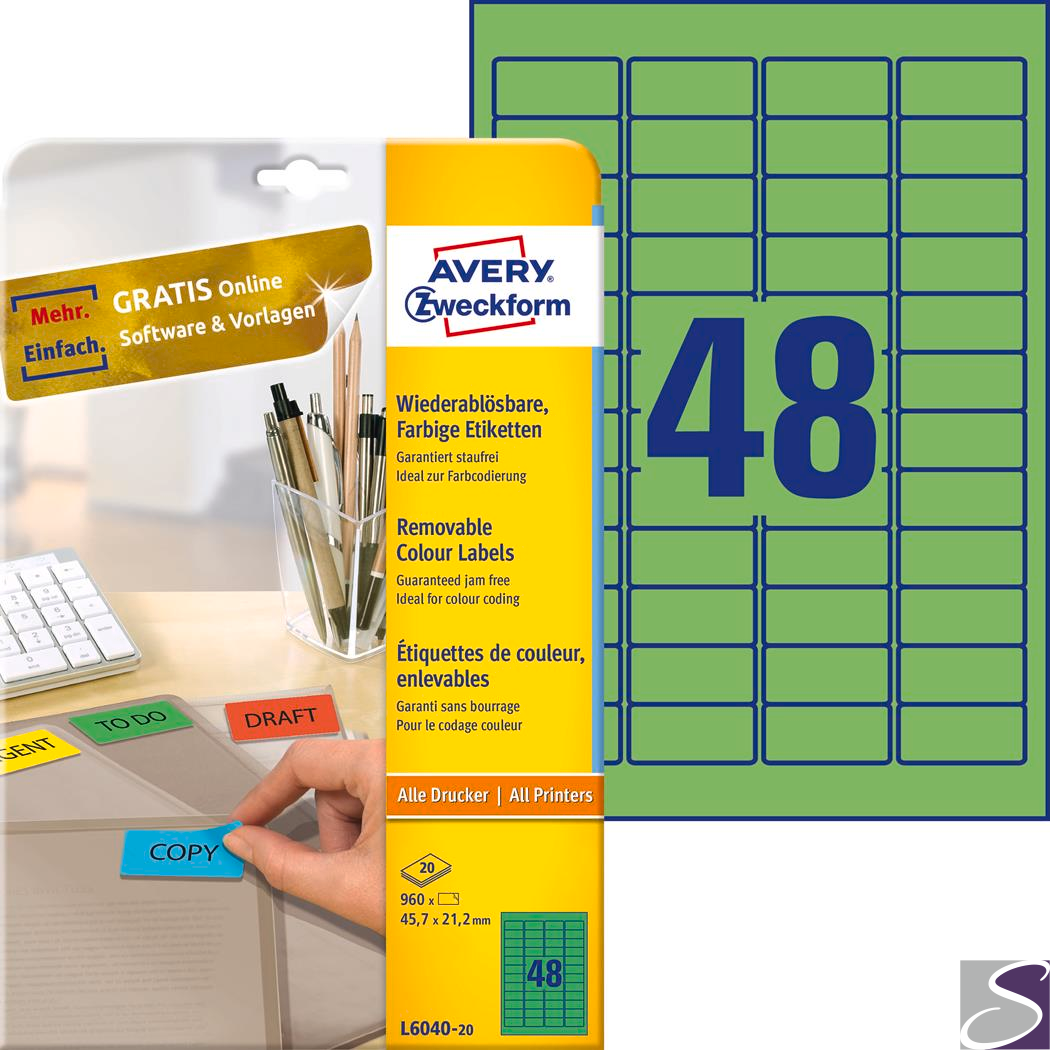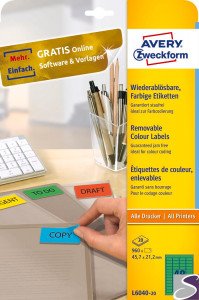 Etykiety zielone L6040-20 45,7 x 21,2 20 ark. Usuwalne, Avery Zweckform