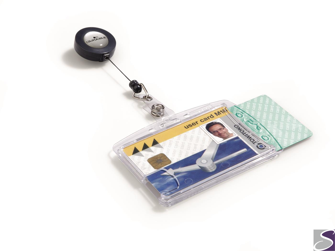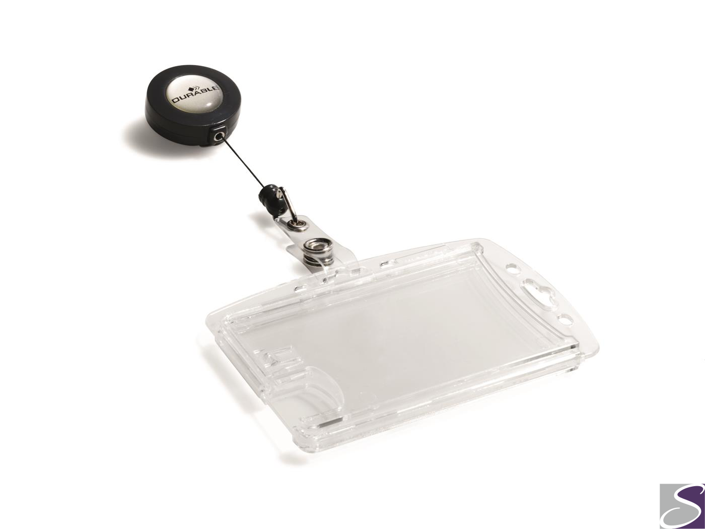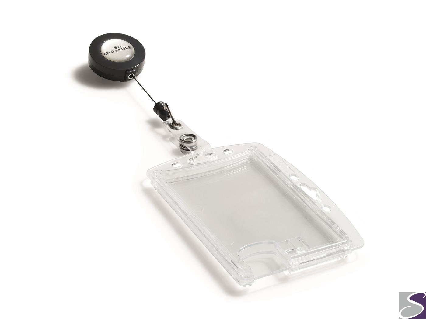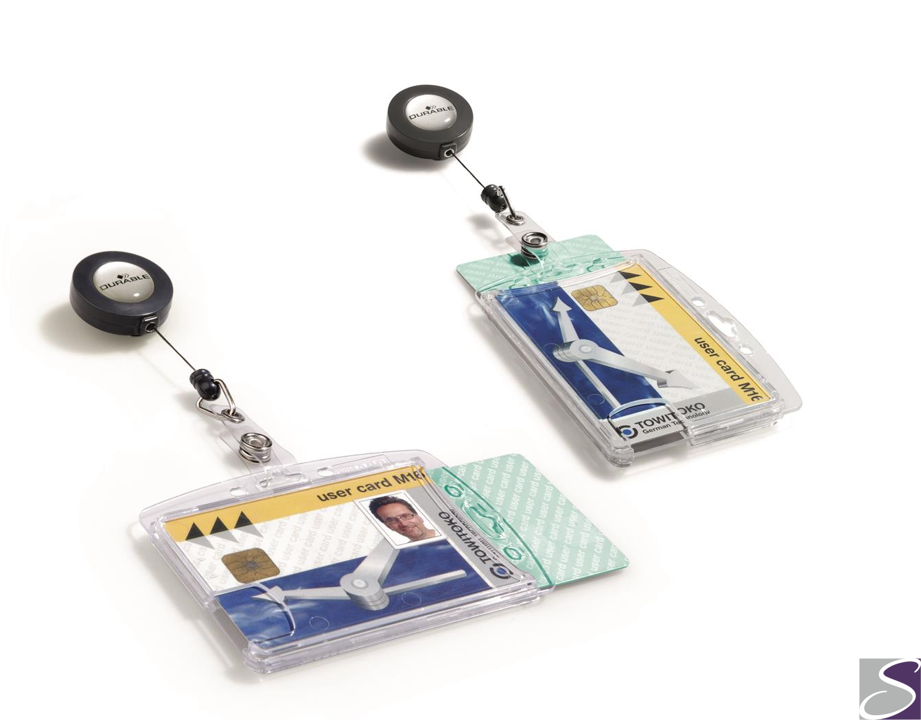 Twarde pudełko na 2 karty skutecznie chroni karty i jednocześnie przez wgłębienie na kciuk umożliwia szybki dostęp do nich. Linka znajdująca się w mechaniźmie ściągającym umożliwia wyciągnięcie identyfikatora na długość do 80 cm. Wymiary 54 x 85 mm.