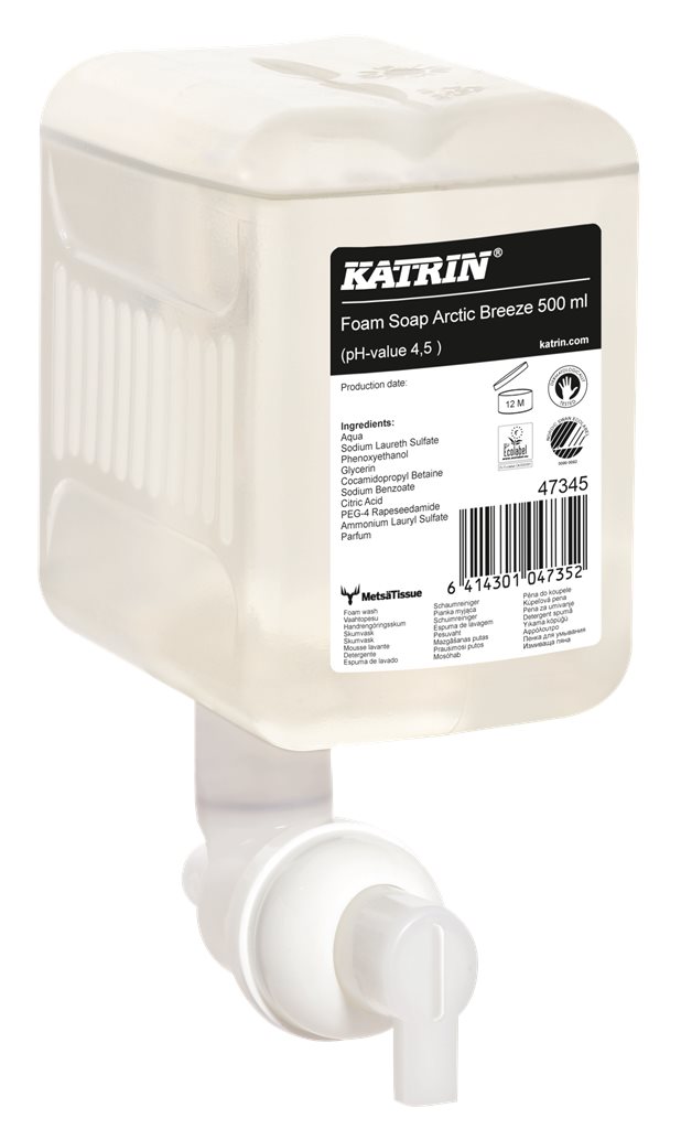 Mydło w piance Katrin Arctic Breeze 500 ml. Wydajne, łagodne mydło w piance o przyjemnym zapachu, bardzo delikatne dla skóry. Przyjemne w użyciu. Pojemność 500 ml wystarcza na 1250 dawek. Wszystkie komponenty zostały starannie dobrane pod względem jakości i specyficznych zastosowań, a także minimalnego wpływu na środowisko. Certyfikat Nordic Swan Eco-label. Certyfikat Ecolabel European Flower. Przebadany i zatwierdzony dermatologicznie i zatwierdzony 92209;90229;92186;90205. Pasujące produkty: 92209;90229;92186;90205.