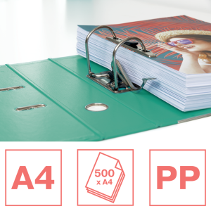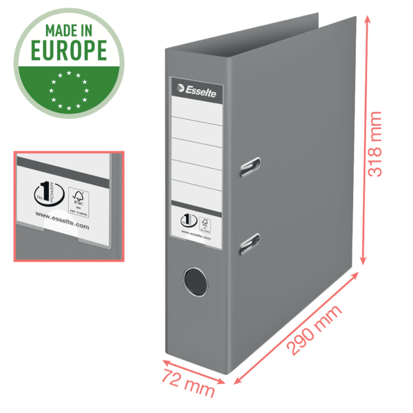 Segregator wyposażono w opatentowany mechanizm dźwigniowy Esselte No.1, który zapewnia perfekcyjne wyrównanie dokumentów i solidne zamykanie nawet po 10 000 użyć. Grzbiet o szerokości 75 mm pozwala przechowywać do 500 kartek A4 (80 g/m²).