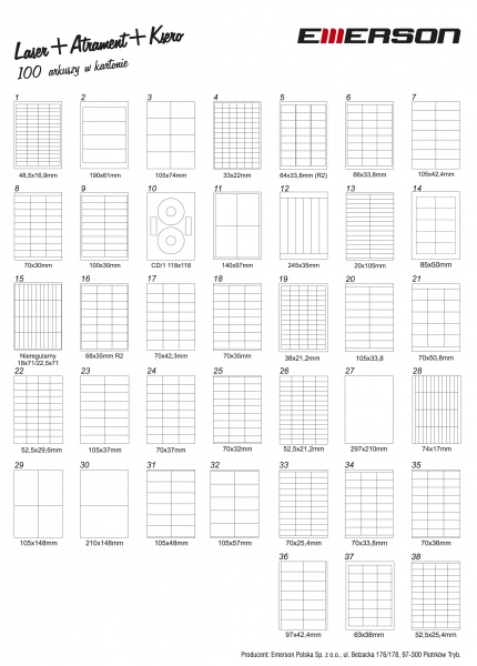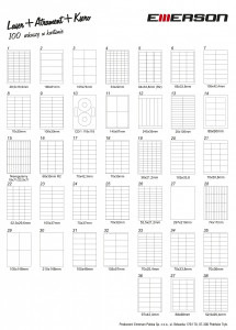 Etykieta samoprzylepna EMERSON nr 028. Etykiety samoprzylepne dostarczane są na arkuszach o formacie A4. Współpracują ze wszystkimi rodzajami drukarek igłowych, atramentowych i z większością drukarek laserowych (patrz zalecenia producenta). W opakowaniu 100 arkuszy. Dostępne w wersji z tzw.Quatro Clean Technology - tj. z krawędziami bezpieczeństwa, które zapobiegają odkładaniu się kleju na mechanizmie drukarki. Jednostka sprzedaży 1 opakowanie.