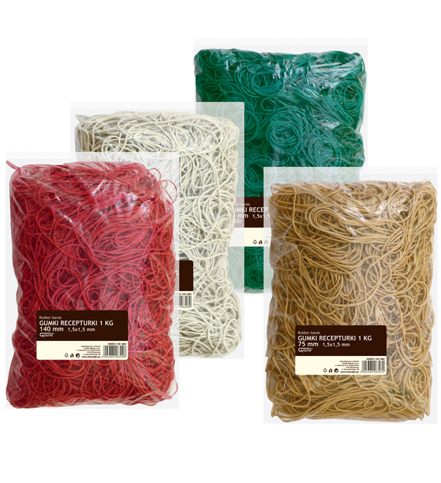 Produkt pakowany jest w woreczki o wadze 1 kg, co zapewnia dużą ilość gumek do codziennego użytkowania w biurach, punktach sprzedaży, magazynach czy podczas pakowania przesyłek.