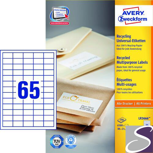 Trwałe recyklingowane etykiety uniwersalne, A4, 100 ark./op., 38 x 21,2 mm, białe, AVERY ZWECKFORM, LR3666