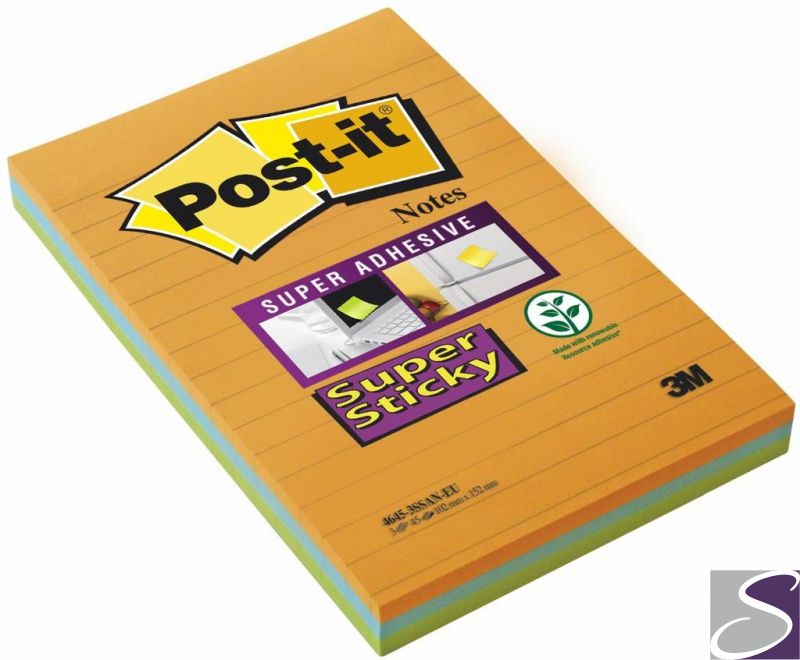 Bloczek samoprzylepny POST-IT_ Super Sticky XXL, w linię (4645-3SSAN ), 101x152mm, 3x45 kart., paleta bankok, 3M-70005253383