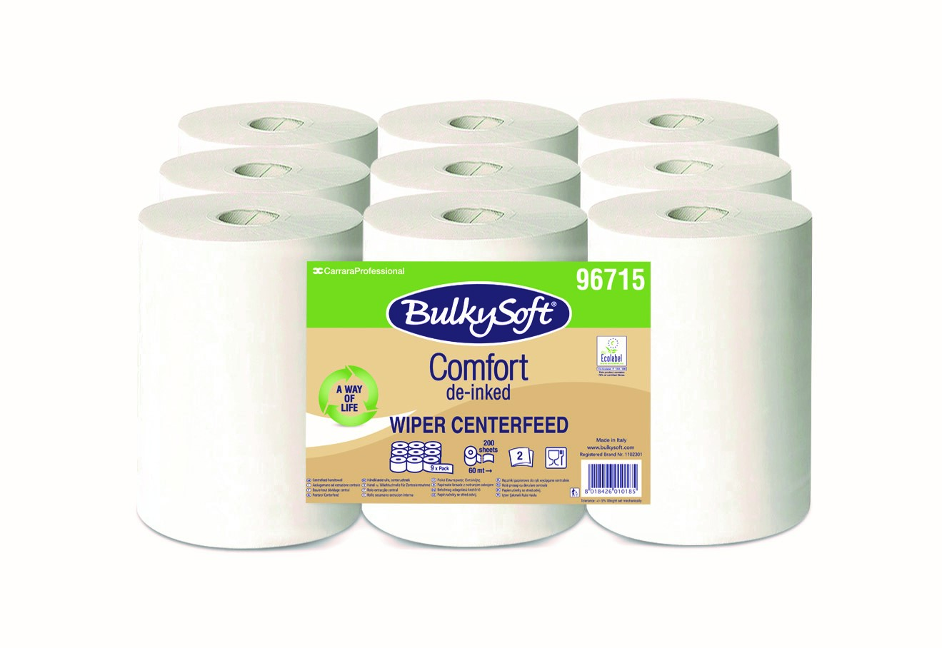 Ręcznik mini w roli centralnego dozowania firmy Bulkysoft dopasowany jest do dozowników tej samej firmy. Stworzony z dwóch warstw wytrzymałego, ale jednocześnie miękkiego i delikatnego papieru, wykonanego z celulozy z dodatkiem celulozy z recyklingu. Można korzystać z niego bez ograniczeń lub dozować listek po listku. Posiada perforacje, które umożliwiają łatwe odrywanie cząstek ręcznika. Świetnie nadaje się do wycierania rąk oraz innych przedmiotów. Nie pozostawia śladów i nie roluje się podczas użytkowania. Przeznaczony do miejsc o małym natężeniu ruchu. Wszystkie ręczniki w roli firmy Bulkysoft de-inkes podsiadają certyfikat dopuszczający produkt do kontaktu z żywnością i certyfikat Ecolabel.