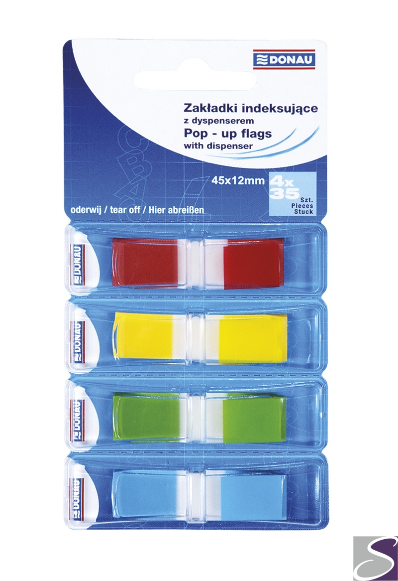 zakładki indeksujące, idealne do pozostawienia wiadomości zarówno w biurze jak i domu_ilość zakładek: 4x35 w rozmiarze 12x45mm_wykonane z folii PP o grubości 60_m_wielorazowe, cienkie_można po nich pisać cienkopisami lub markerami_dyspenser wykonany z PP_perforacja umożliwia oderwanie każdego bloczka_zakładki w intensywnych, żywych kolorach_substancja klejąca na bazie wody_mix kolorów