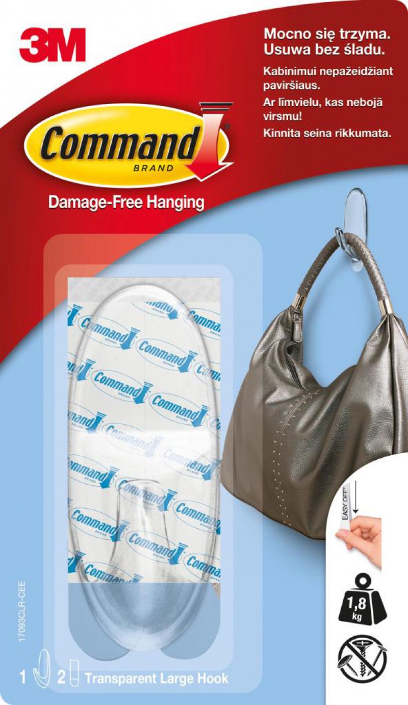 zapomnij o gwoździach, śrubokrętach czy wiertarkach z Command haczyki można łatwo i szybko zamontować haczyki do dekorowania dopuszczalne obciążenie do 1800 g na 1 pasek mocno się trzyma, łatwo usuwa, nie niszczy powierzchni. W opakowaniu 1 hak oraz 2 duże paski. Kolor: transparentny.