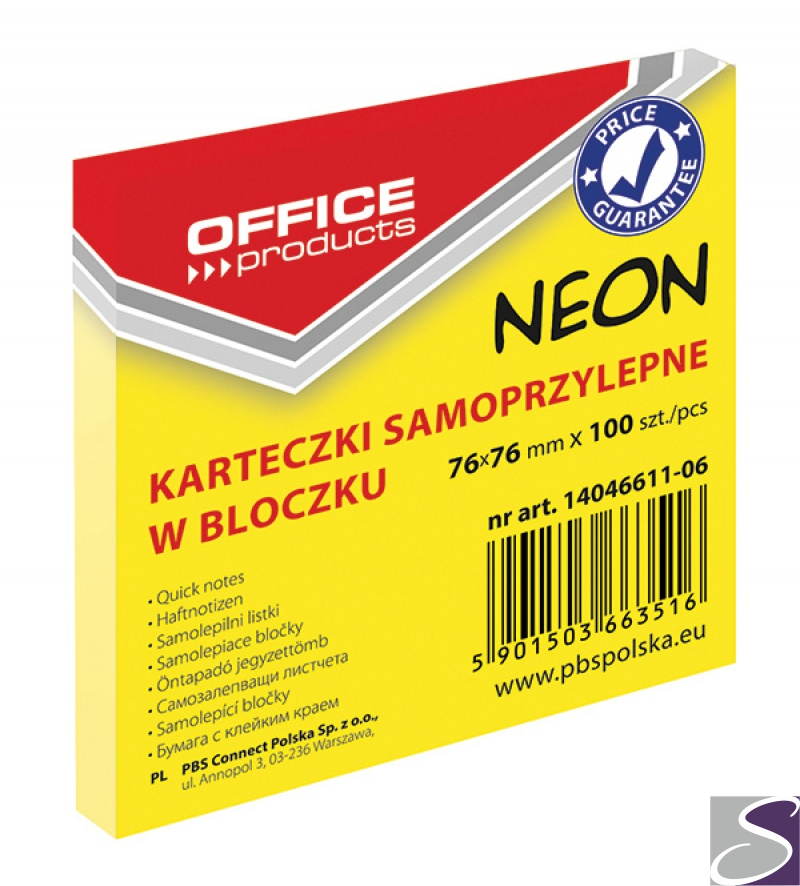 Bloczek samoprzylepny 76x76 mm 1x100 kart. neon żółty OFFICE PRODUCTS