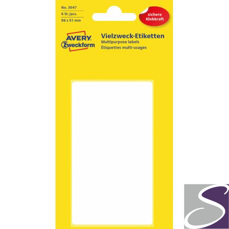 Trwałe minietykiety do opisywania ręcznego, 6 etyk./op., 98 x 51 mm, białe, AVERY ZWECKFORM, 3047