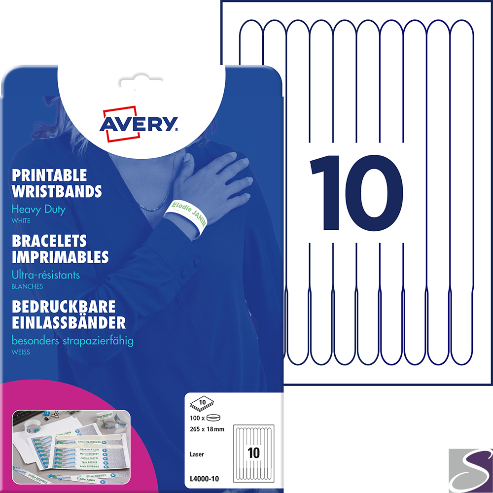 • Łatwe do zadruku na własnym komputerze (logo, nazwa wydarzenia itp.) - projektuj i drukuj spersonalizowane opaski na nadgarstek w szybki i prosty sposób przy użyciu bezpłatnych szablonów oraz oprogramowania od Avery Zweckform dostępnego na: avery-zweckform