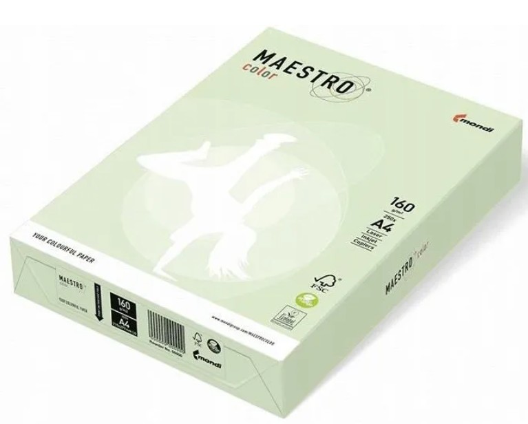 Najwyższej jakości papier biurowy barwiony w masie celulozowej. Polecany do wydruków w drukarkach laserowych i atramentowych, a także w wysoko-nakładowych urządzeniach kopiujących. Zachowuje odporność barwy na starzenie. Dostępny w formatach A4, A3 w gramaturze 80 g/m2 oraz w A4 w gramaturze 160 g/m2 . W gramaturze 80 g/m2 pakowany jest po 500 arkuszy w ryzie, w gramaturze 160 g/m2 po 250 arkuszy w opakowaniu. Produkcja papierów MAESTRO jest zgodna z normami ochrony środowiska._Szeroka paleta 29 kolorów, dostępna w 4 grupach kolorystycznych: pastelowej, intensywnej, Trend i Neonowy odcień._Dostępne kolory: wanilia-BE66, kremowy -CR20, żółty-YE23, łososiowy- SA24, flamingo-OPI74, różowy-PI25, jasna zieleń-GN27, zielony-MG28, błękit arktyczny-OBL70, jasny niebieski-BL29, niebieski-MB30, cytrynowy -ZG34, złoty-GO22, złota patyna-AG10, lawenda-LA12, szary-GR21, kanarkowy-CY39, żółć siarkowa-IG50, żółty słoneczny-SY40, czerwień ceglasta-ZR0(tylko 80gsm), pomarańczowy-0R43, czerwień koralowa-CO44, zieleń limonki-LG