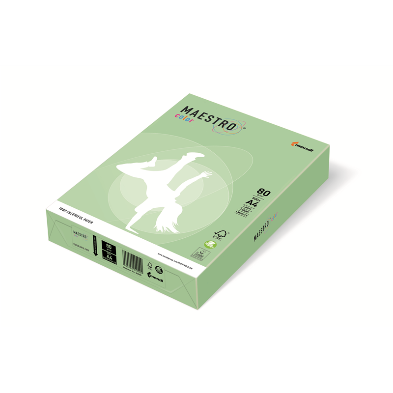 Najwyższej jakości papier biurowy barwiony w masie celulozowej. Polecany do wydruków w drukarkach laserowych i atramentowych, a także w wysoko-nakładowych urządzeniach kopiujących. Zachowuje odporność barwy na starzenie. Dostępny w formatach A4, A3 w gramaturze 80 g/m2 oraz w A4 w gramaturze 160 g/m2 . W gramaturze 80 g/m2 pakowany jest po 500 arkuszy w ryzie, w gramaturze 160 g/m2 po 250 arkuszy w opakowaniu. Produkcja papierów MAESTRO jest zgodna z normami ochrony środowiska._Szeroka paleta 29 kolorów, dostępna w 4 grupach kolorystycznych: pastelowej, intensywnej, Trend i Neonowy odcień._Dostępne kolory: wanilia-BE66, kremowy -CR20, żółty-YE23, łososiowy- SA24, flamingo-OPI74, różowy-PI25, jasna zieleń-GN27, zielony-MG28, błękit arktyczny-OBL70, jasny niebieski-BL29, niebieski-MB30, cytrynowy -ZG34, złoty-GO22, złota patyna-AG10, lawenda-LA12, szary-GR21, kanarkowy-CY39, żółć siarkowa-IG50, żółty słoneczny-SY40, czerwień ceglasta-ZR0(tylko 80gsm), pomarańczowy-0R43, czerwień koralowa-CO44, zieleń limonki-LG