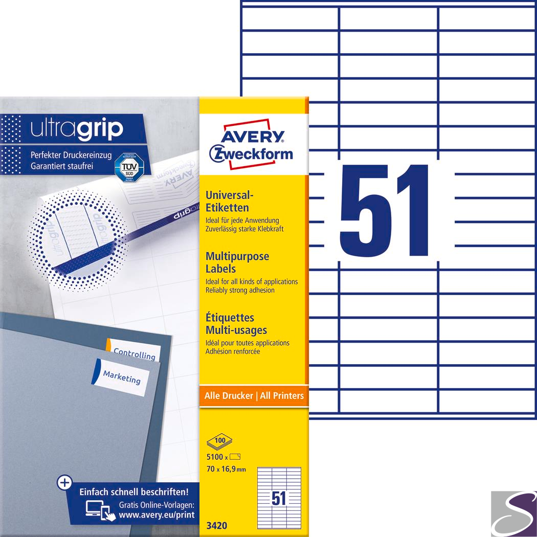 Trwałe etykiety uniwersalne 3420 70x16,9 100ark białe, Avery Zweckform