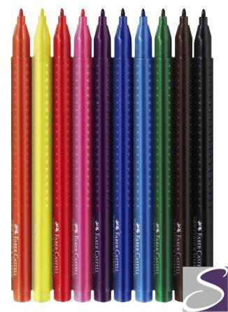 Flamastry Faber-Castell z serii Grip 10 kolorów w opakowaniu kartonowym. Odpowiednie dla starszych i młodszych dzieci. Ergonomiczny trójkątny kształt zapewnia wysoki komfort użytkowania i niemęczące, wygodne rysowanie. Z charakterystyczną dla tej serii opatentowaną strefą Grip z małymi punktami. Końcówka pisząca jest odporna na duży nacisk, nawet do 3 kg. Z tuszem na bazie wody i barwników naturalnych. Zachwycają jasnymi i wyrazistymi kolorami, spieralnymi z większości standardowych tkanin. Odpowiednie dla osób prawo- i leworęcznych.