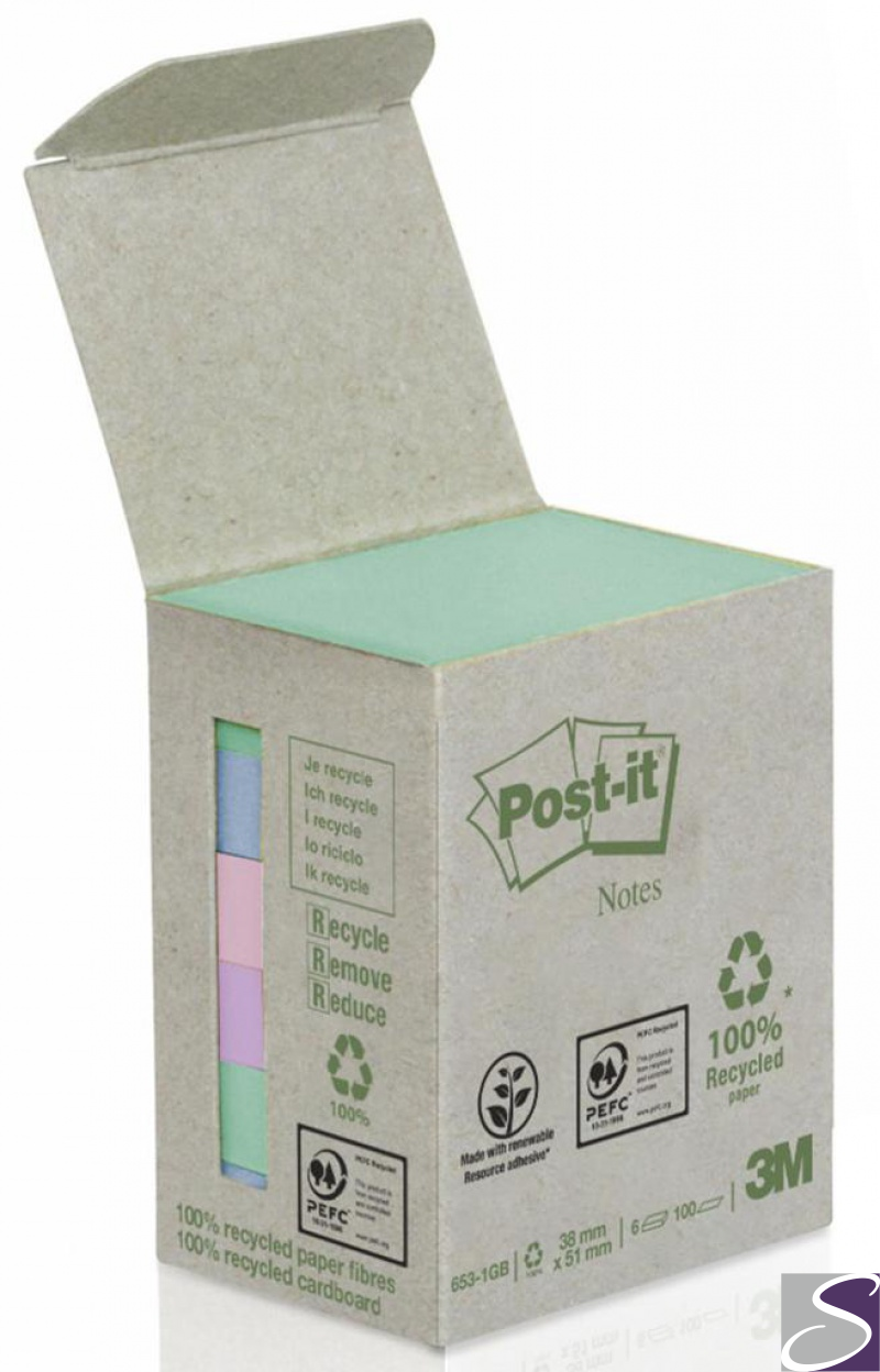 Bloczki ekologiczne POST-IT (653-1GB), 38x51mm, 6x100 kart., mix kolorów